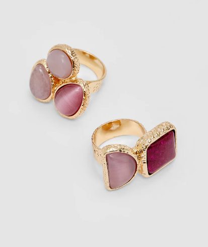 Los anillos también son complementos que no querrás que falten en tu joyero esta temporada. En este caso, unos de los que más llaman la atención de Stradivarius son estos. Se presentan en set de dos, cuentan con base metalizada en color dorado, y destacan gracias a detalles como sus piedras de tonos rosados, algunas más claras y otras más oscuras. En cuanto a su precio, te puedes hacer con ellos por tan solo 12,99 euros el conjunto.