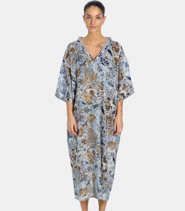 Este caftán de algodón orgánico presenta un estampado paisley que evoca los mágicos viajes por la ruta de la seda. Su tejido ligero y suave lo hace perfecto para deslizarlo sobre el traje de baño, permitiendo una transición elegante desde la playa hasta el paseo marítimo.
