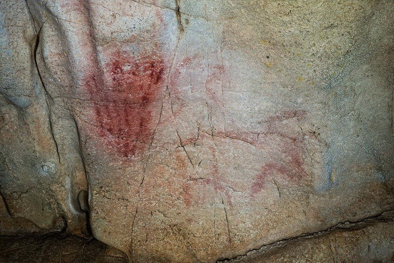 Dentro de la cueva, en el vestíbulo, se pueden observar representaciones artísticas de animales, y lo más llamativo son las composiciones de grandes puntos rojos que simbolizan genitales femeninos.
