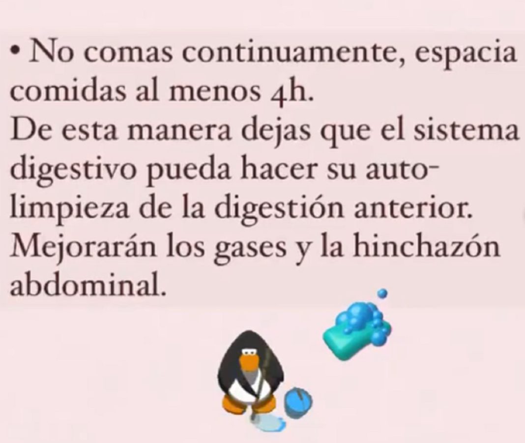 La dietista-nutricionista Blanca García-Orea, popularmente conocida en Instagram como Blanc Nutri, dedicó una publicación de Instagram a hablar de esto. Brindó recomendaciones para saber qué hacer en esta situación. Entre sus consejos para dejar atrás la inflamación abdominal está espaciar comidas, hacer ayunos y tomar infusiones. Recomienda tratar de especiar comidas al menos 4 horas. “Dejas que el sistema digestivo pueda hacer su autolimpieza de la digestión anterior. Mejorarán los gases y la hinchazón abdominal”, señala.