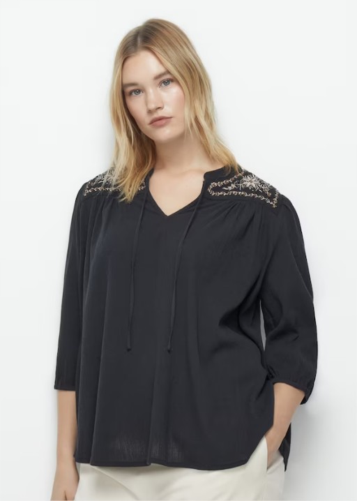 El negro nunca pasa de moda, y esta blusa con bordados es prueba de ello. Su diseño intrincado refleja la atención al detalle, y el color profundo aporta un aire sofisticado a cualquier look.