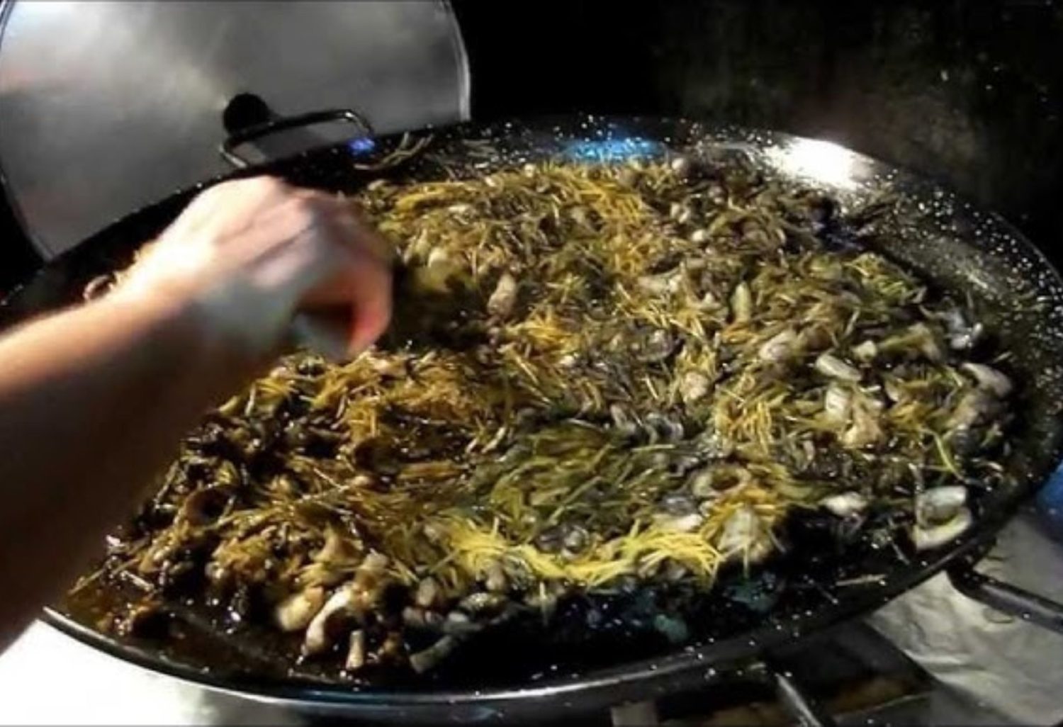 La preparación de la fideuá negra de sepia alcanza su punto culminante al incorporar los fideos al sofrito, asegurando que absorban los sabores. Luego, el caldo se vierte cuidadosamente en la paellera, seguido de la tinta de calamar, que tiñe los fideos de un negro profundo mientras se mezcla.