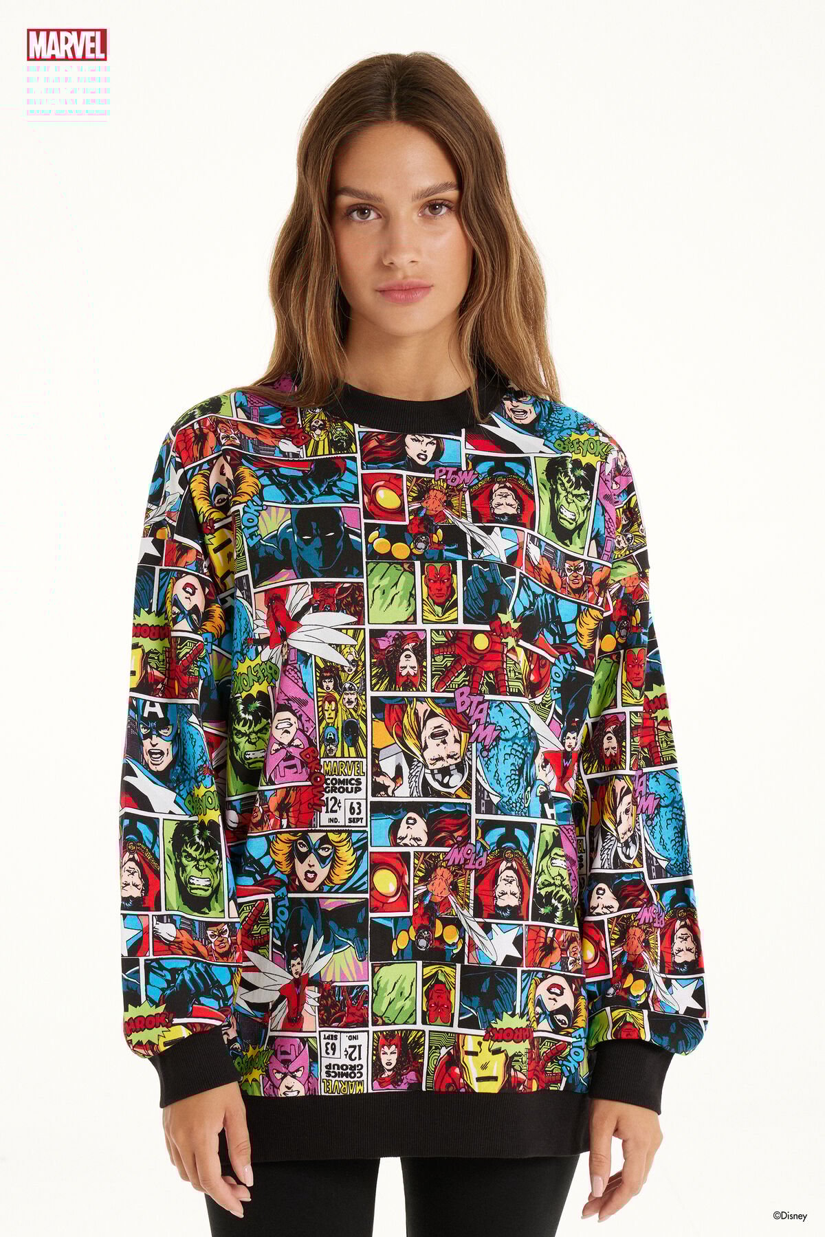 Otra de las sudaderas de mujer que más destacan en esta colección de Tezenis es esta. De manga larga, diseño oversize y cuello redondo, muy favorecedor, esta prenda llama la atención, sobre todo, gracias a su estampado. Se trata de un estampado integral, en forma de cómics, donde puedes ver a algunos de tus personajes favoritos en una explosión de color. En cuanto a su precio, te puedes hacer ya con ella por solo 25,99 euros. No la querrás dejar escapar.