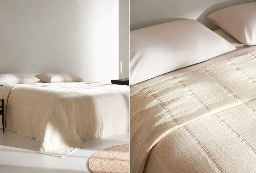 Si también estás pensando en cambiar tu dormitorio, uno de los elementos de los que no te puedes olvidar es la colcha. En este caso, una de las que más destacan en Mango es esta, elaborada con algodón y lino. Muy suave y fácil de combinar, gracias a su suave tono neutro, se convertirá en uno de los básicos de tu hogar. Además, te puedes hacer con ella por 99,99 euros. Sin duda, será una de esas inversiones que merecen la pena por su calidad.