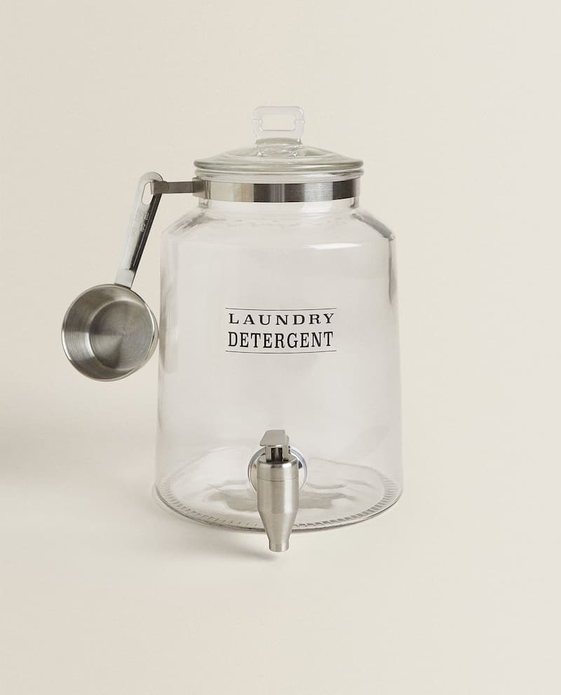 Si estás buscando darle un toque elegante y vintage a tu zona de lavandería, échale un ojo a este bonito dispensador de detergente. Este frasco de cristal cuenta con una tapa hermética diseñada especialmente para detergente líquido, además de un práctico dispensador y una cuchara medidora. Con una capacidad de 3 litros, es ideal para rellenar y así evitar el uso de envases contaminantes. Además, le dará un encanto especial a tu espacio de lavandería. Puedes encontrar cada frasco por 29,99 euros en Zara Home.