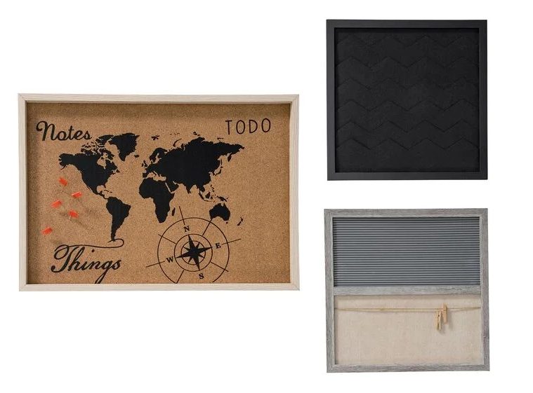 El modelo gris tiene una superficie para clavar notas, y otra con una cuerda y 2 pinzas para fotos o notas; además incluye 124 letras y cifras. El tablero negro tiene una superficie de fieltro para fotos, postales y notas. El modelo mapamundi tiene toda la superficie de corcho, y viene con 5 banderitas incluidas. Además de prácticos, son muy decorativos para el dormitorio, el salón o el despacho. El precio de cada uno es de 5,99€.