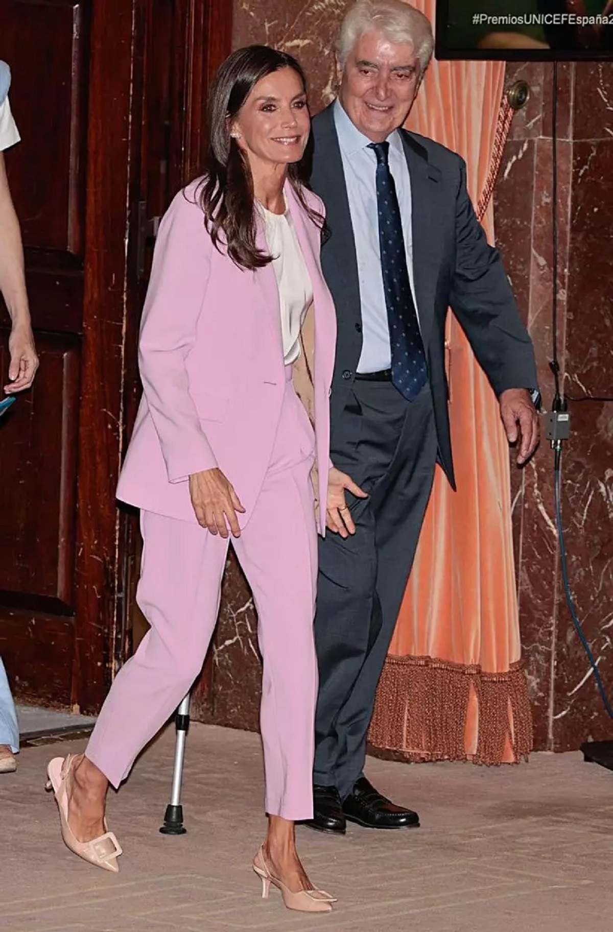 No faltó el color de moda: el rosa. La moda Barbiecore está más que extendida entre las celebridades de todo el mundo y la monarca no iba a quedarse atrás. Eso sí, con la sofisticación que caracteriza a una ‘royal. Fue a juego con lookazo que se marcó Sara Carbonero, con quien se reencontró en la gala. Culmino su estilismo con unas sandalias de tacón moderado de la firma española de Isabel Abdo y una blusa blanca fruncida.