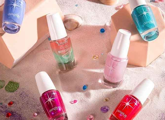 Los tonos son rosa, fucsia, turquesa, coral y azul, además del aceite bifásico para hidratar las uñas y las cutículas y que tiene aroma a sandía. este último debe ser muy bien agitados para que sus componentes se mezclen bien antes de aplicarlos sobre la uña y las cutículas.