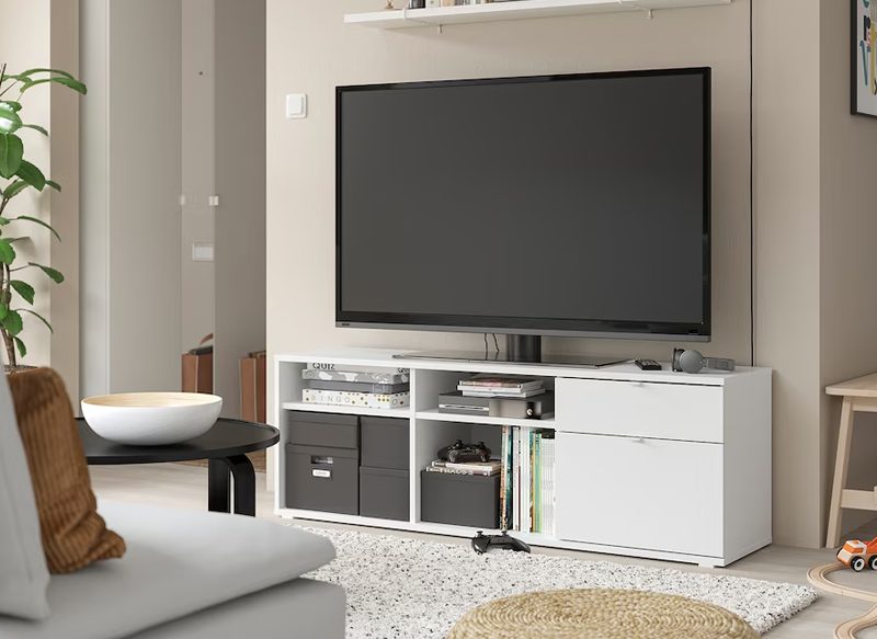 Por otro lado, en Ikea también podemos encontrar con el mueble de TV VIHALS en su enorme catálogo, un modelo que está disponible en color blanco y que ofrece una solución sencilla pero muy práctica. Sus dimensiones son de 146 x 37 x 50 cm y su precio de venta actual es de 129 euros.