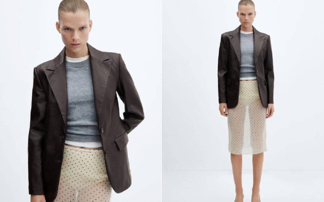 El diseño entallado hace una figura espectacular a cualquiera que la lleve puesta y el efecto piel lo convierte en algo de otro planeta. Cuello pico con solapa, solapas con muesca, manga larga con puños abotonados, cierre de dos botones en la parte delantera, dos bolsillos de solapa en la parte frontal, hombreras… Es una de esas piezas que se han pensado milimétricamente para que alcances el éxito más absoluto. Solo una persona con las ideas claras y una pisada firme podría lucirla como se merece. Cuenta también con un detalle de pinzas y un forro interior. Este espectacular modelo ideal para tus próximos looks de oficina se consigue por 69,99 euros.