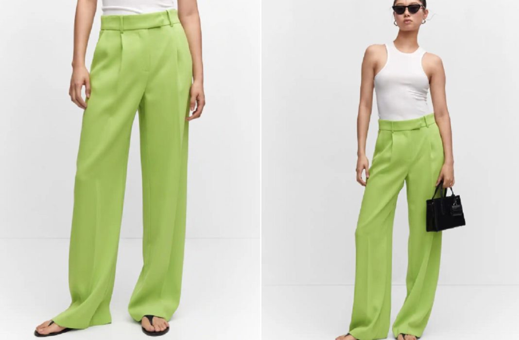 Una oda al confort y al glamour. La fusión de estos dos soberanos conceptos da como resultado un pantalón wiedeleg cómodo, de tiro medio y diseño largo. Muestra la imagen de seriedad mezclada con la distensión de aquellos/as que tienen el control 24/7. Cuenta con bolsillos laterales, un cierre oculto de botón, gancho, cremallera y detalle de pinzas. Está disponible en color negro clásico y lima. Escoger uno u otro dependerá de la ocasión y de tus preferencias. Su precio en cualquiera de los casos es 39,99 euros.