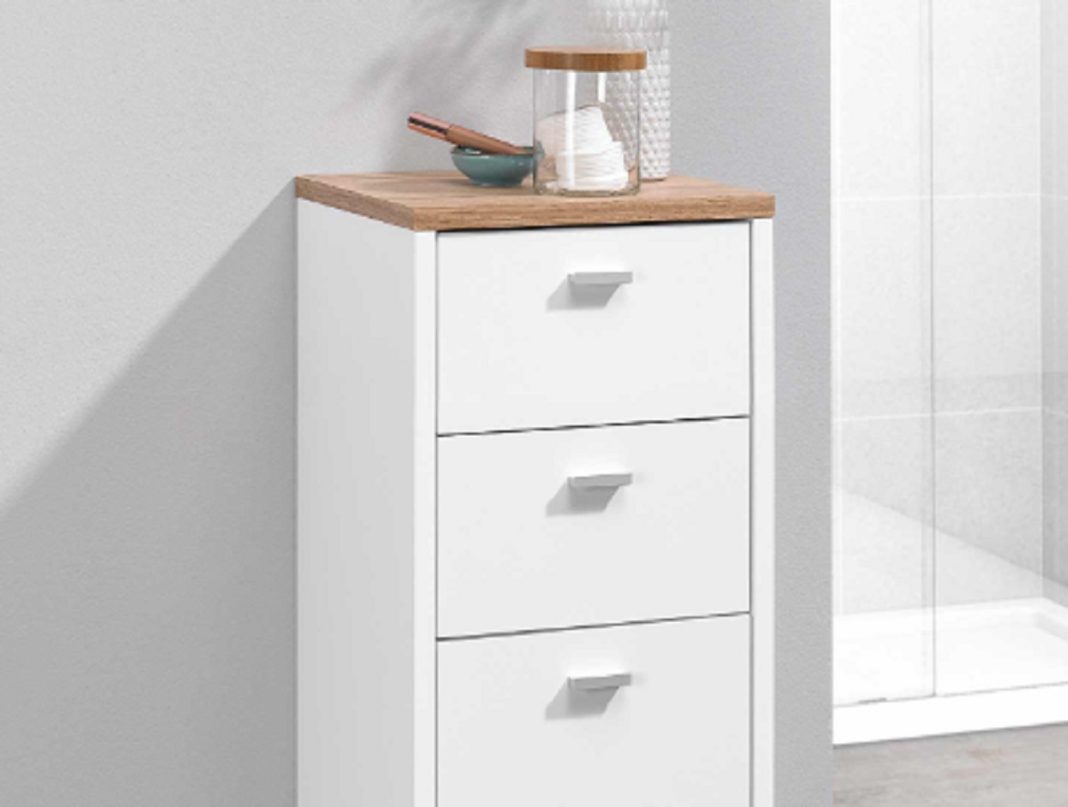 El baño tiene pocas funcionalidades, pero suele ser un espacio en el que guardamos jabones, champús, perfumes, cremas y un largo etcétera. Cuanto más espacio tengamos para guardar nuestros bienes ¡muchísimo mejor! Este armario con un material similar a la madera de roble nos permite gozar de un acabado estético sublime, además de aportar funcionalidad al espacio. Sus medidas son: 96 x 28 x 32 cm. Cuenta con una puerta y 2 cajones de diseño moderno. Su altura es regulable, la puerta se puede montar en ambos lados y cuenta con tiradores de metal. Vale 35,99 euros.