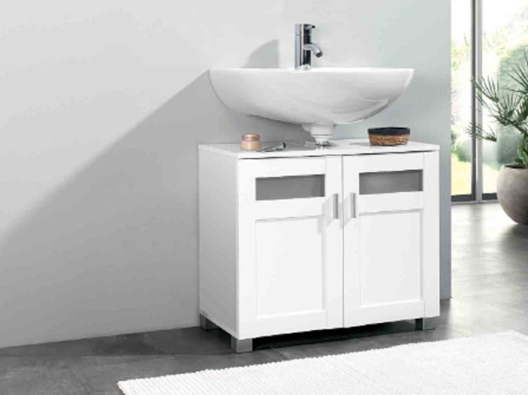 Lidl se lleva la palma con este mueble top con puertas con aplicaciones de vidrio de seguridad satinado. Estéricamente queda igual. Posee un corte especial para el desagüe, por lo que podrás utilizarlo como un armario más o el mueble en el que te lavas los dientes. Es aplicable para la mayoría de los lavabos convencionales, resistente a arañazos y fácil de limpiar. Cuenta con tiradores de metal. Uno de sus puntos fuertes: sus pies no rayan el suelo. Esta maravilla está disponible por 54,99 euros. Incluye material e instrucciones de montaje.