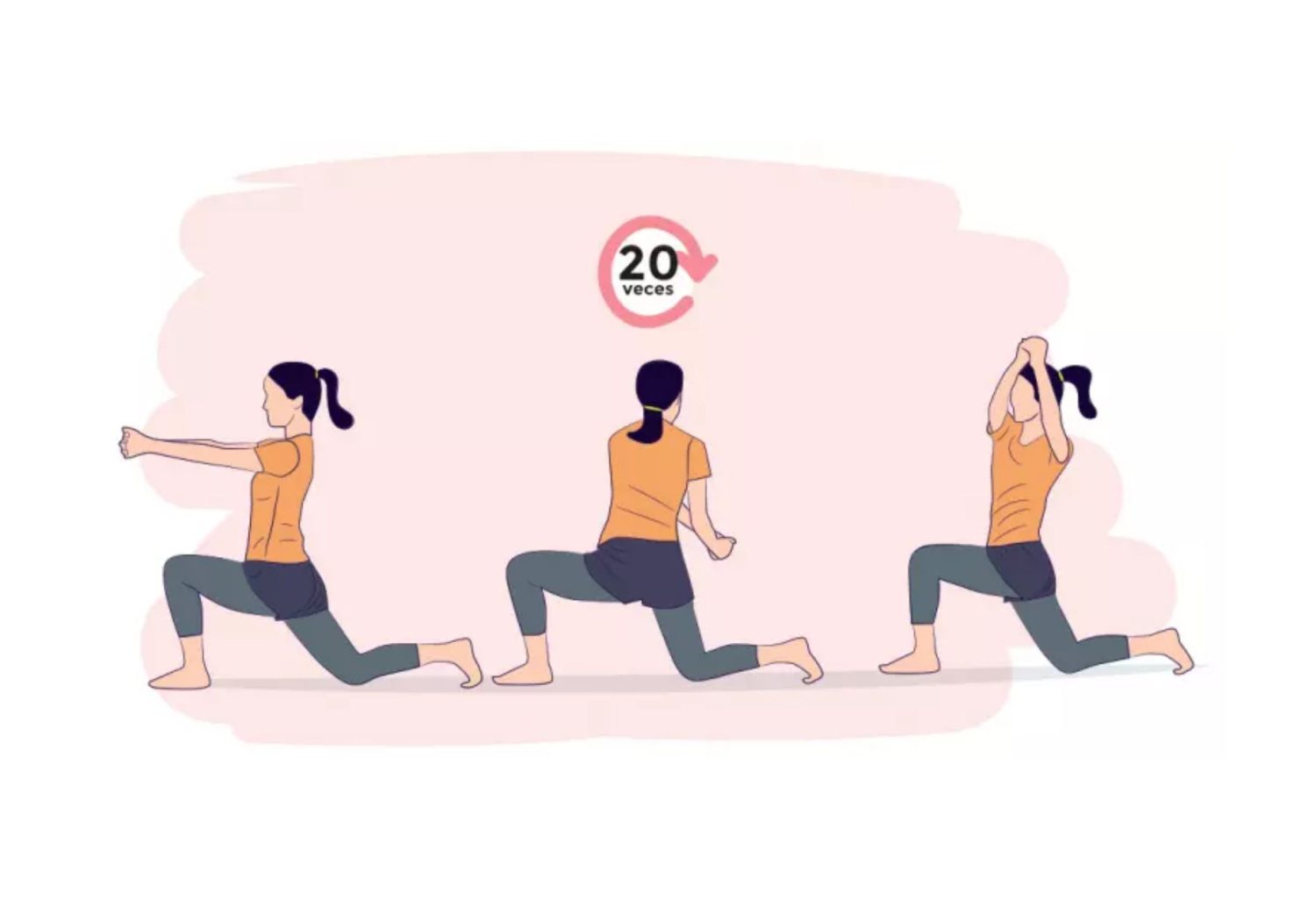 Para llevar a cabo este ejercicio, flexiona una rodilla en ángulo recto y deja la otra detrás de ti, como se muestra en el dibujo, manteniendo la punta del pie en el suelo. Estira los brazos hacia adelante y entrelaza los dedos, luego gira el torso y los brazos todo lo que puedas hacia el lado donde tienes la rodilla apoyada, sin mover los brazos hacia arriba ni hacia abajo. Luego, gira hacia el lado contrario y cuando llegues a tu límite, levanta los puños formando una diagonal. Realiza este ejercicio 20 veces, cambia el apoyo de las piernas y repite otras 20 veces.