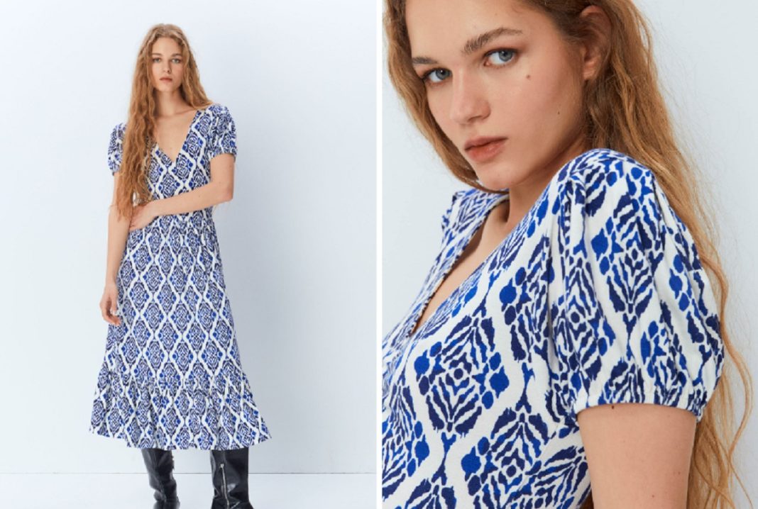 De cuello pico y mana corta abullonada, este vestido es de lo mejorcito que hay. Existen varias opciones para sacarle el máximo partido. Por ejemplo, se puede utilizar con botas, mocasines, zapatos de vestir, tacones o hasta con deportivas. Esta prenda puede convertirse en lo que necesitas que sea. Dependiendo de lo que necesites puedes optar por unas opciones u otras. Esta una propuesta atemporal, por lo que puedes utilizarla todo el año, todos los años, sin que eso suponga que queda desactualizada o fuera de lugar. Los estampados suelen dar apuro cuando no estamos habituadas a ellos, pero esta pieza presenta uno sublime: elegante y fino como él solo. ¿Te gusta sacarte fotos para las redes sociales? Te convertirás en tendencia llevando esta prenda con el mayor de los estilos. Otro punto a favor es que no se trata de un vestuario que entienda de edades. Queda bien tanto si tienes 20 como si tienes 40. Solo tienes que adaptarla a tu estilo personal y salir a brillar. Su precio es 19,99 euros.