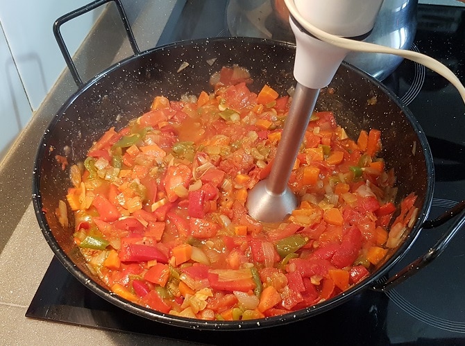 Después de agregar el caldo y ver que todas las verduras están bien cocinadas, es el momento de triturar el sofrito y volver a colocarlo en la olla. Como te decíamos, si prefieres no triturar, lo único que debes hacer es dejar los ingredientes cocinándose unos cinco minutos más junto al caldo. Después, debes continuar el proceso en el siguiente paso. Como ves, esta receta es muy sencilla pero tiene un sabor excelente.