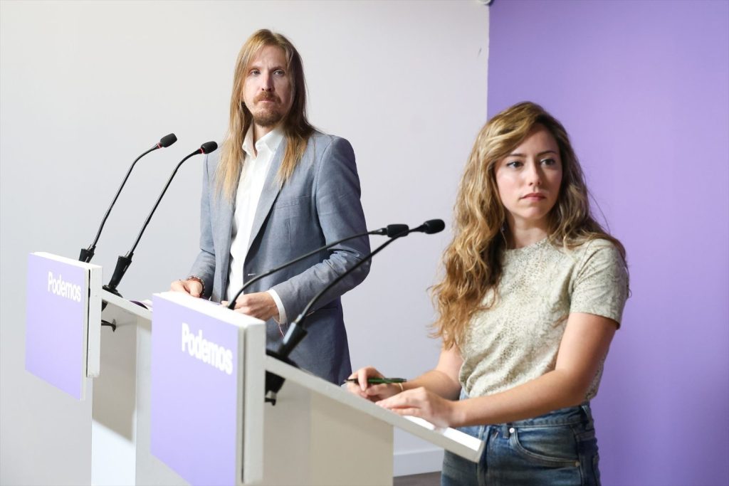 El coportavoz de la formación morada, Pablo Fernández, junto a la secretaria de Acción Institucional de Podemos, María Teresa Pérez, han marcado los requisitos necesarios para dar sus votos al presidente del Gobierno en funciones, Pedro Sánchez, de cara a su posible investidura.