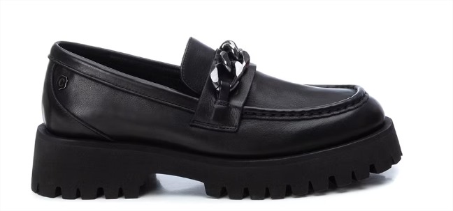 Elegancia y sofisticación se unen en estos mocasines de piel color negro con un poco de plataforma. El detalle de cadena en la parte delantera les otorga un aire moderno y chic, perfecto para las amantes del detalle y la moda.