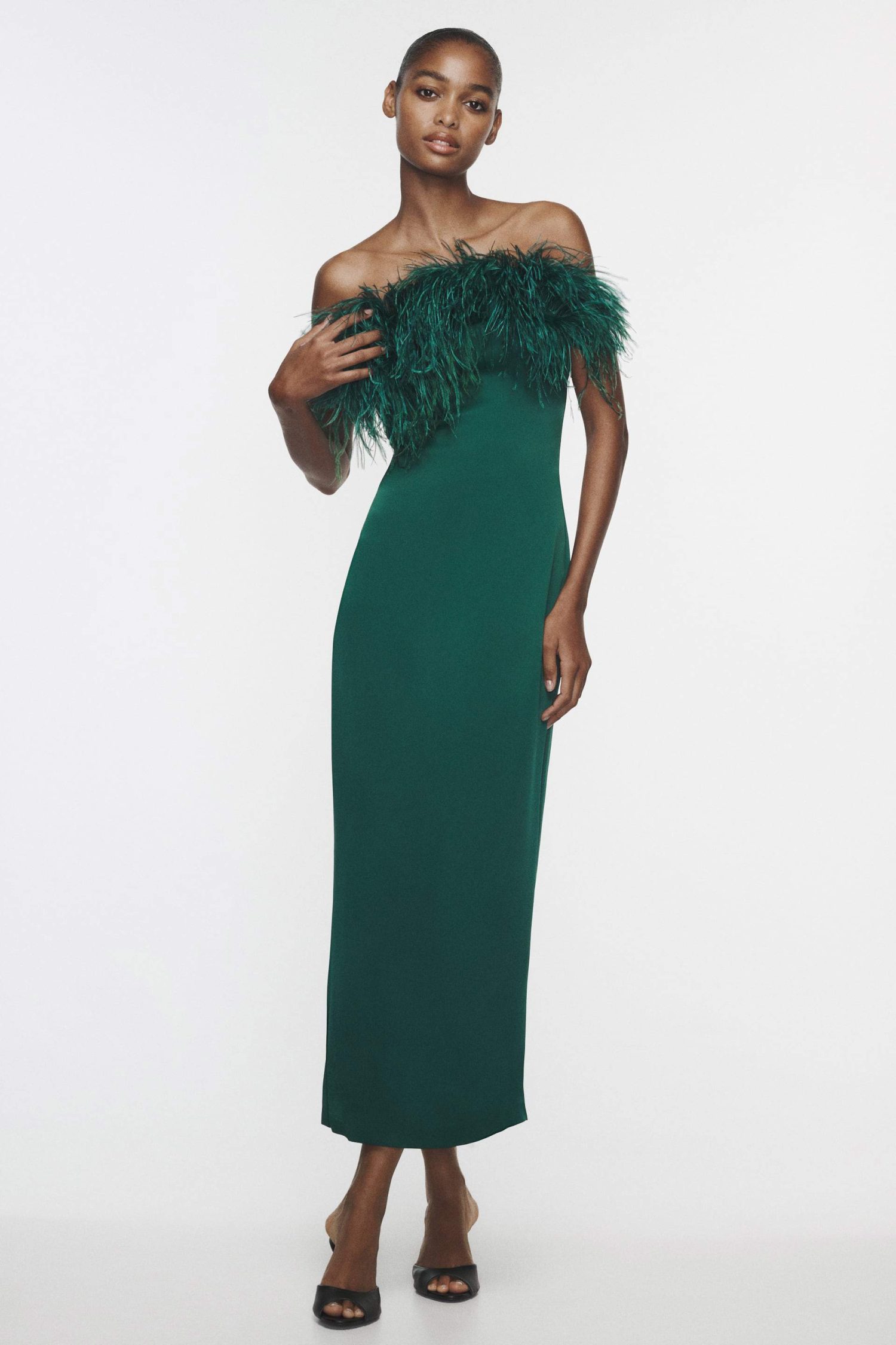 Otro de los vestidos que puedes encontrar dentro de la sección de novedades de Zara y que no querrás dejar pasar esta nueva temporada es este. De diseño largo y ceñido al cuerpo, uno de los detalles por los que más llama la atención es por su escote palabra de honor cubierto de plumas, que captarán todas las miradas. Disponible en un bonito color verde botella, ideal para las fiestas otoñales, así como para las navideñas, se convertirá en otra de las piezas más sofisticadas de tu armario. Además, su diseño no puede estilizar más gracias a su corte recto. En cuanto a su precio, te puedes hacer ya con él por 99,95 euros.