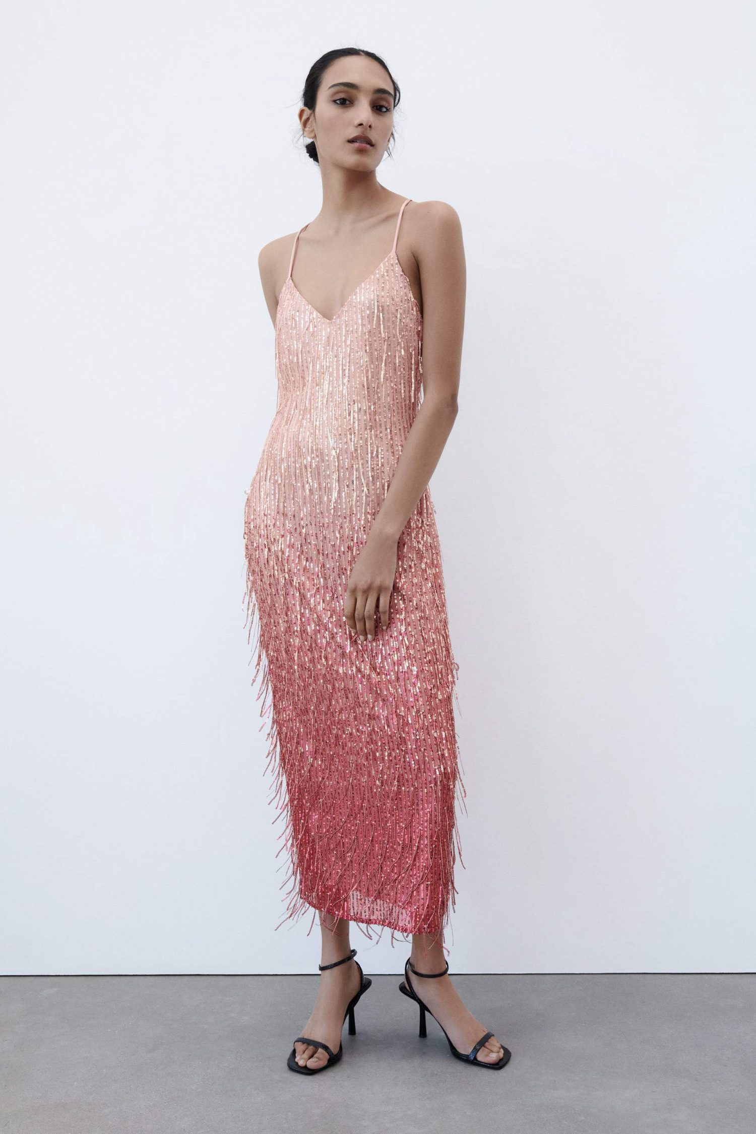 Los vestidos largos causarán furor esta temporada. Pensando en las próximas fiestas, sin duda son de los más favorecedores que puedes encontrar dentro de la sección específica de Zara. En concreto, uno de los que más captarán tu atención es este. Se trata de un diseño largo hasta el tobillo que destaca por estar cubierto al completo por lentejuelas. Además, otro de los detalles por lo que lo querrás en tu armario es su tono, un degradado de rosa que no puede ser más romántico. De diseño lencero y con unos colores equilibrados y armoniosos, te puedes hacer con esta original prenda por solo 49,95 euros.