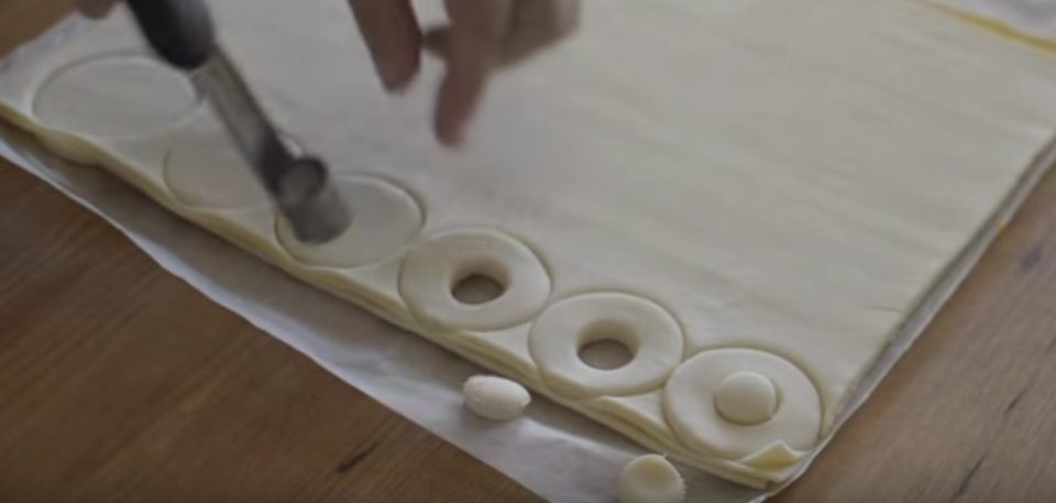 Lo primero que vamos a hacer es cortar el hojaldre con un cortapastas circular de 5 cm de diámetro. Se hacen tantos aros como se desee. Luego se corta otro círculo más pequeño por cada aro. Y reposar. Seguidamente se cuecen en el horno a 180 grados durante 25 minutos. Y se dejan enfriar. Ya sabes que en repostería, los tiempos de cocción y las medidas son imprescindibles.