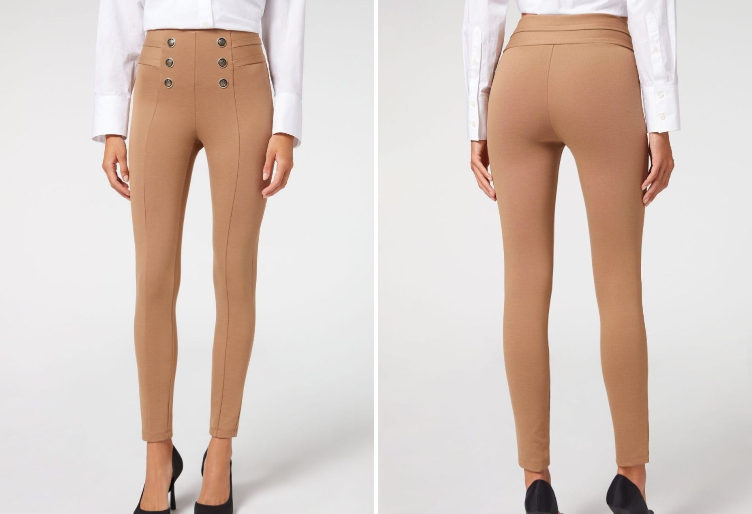 Los nuevos «Leggings Skinny Modelo Marinero» de Calzedonia encarnan la sofisticación moderna con su diseño único y detalles meticulosos. Confeccionados en un tejido moldeador que abraza la figura con gracia, estos leggings destacan por la aplicación meticulosa de botones decorativos dorados y un juego de costuras elegantes que realzan la cintura y recorren toda la longitud de la pierna.
