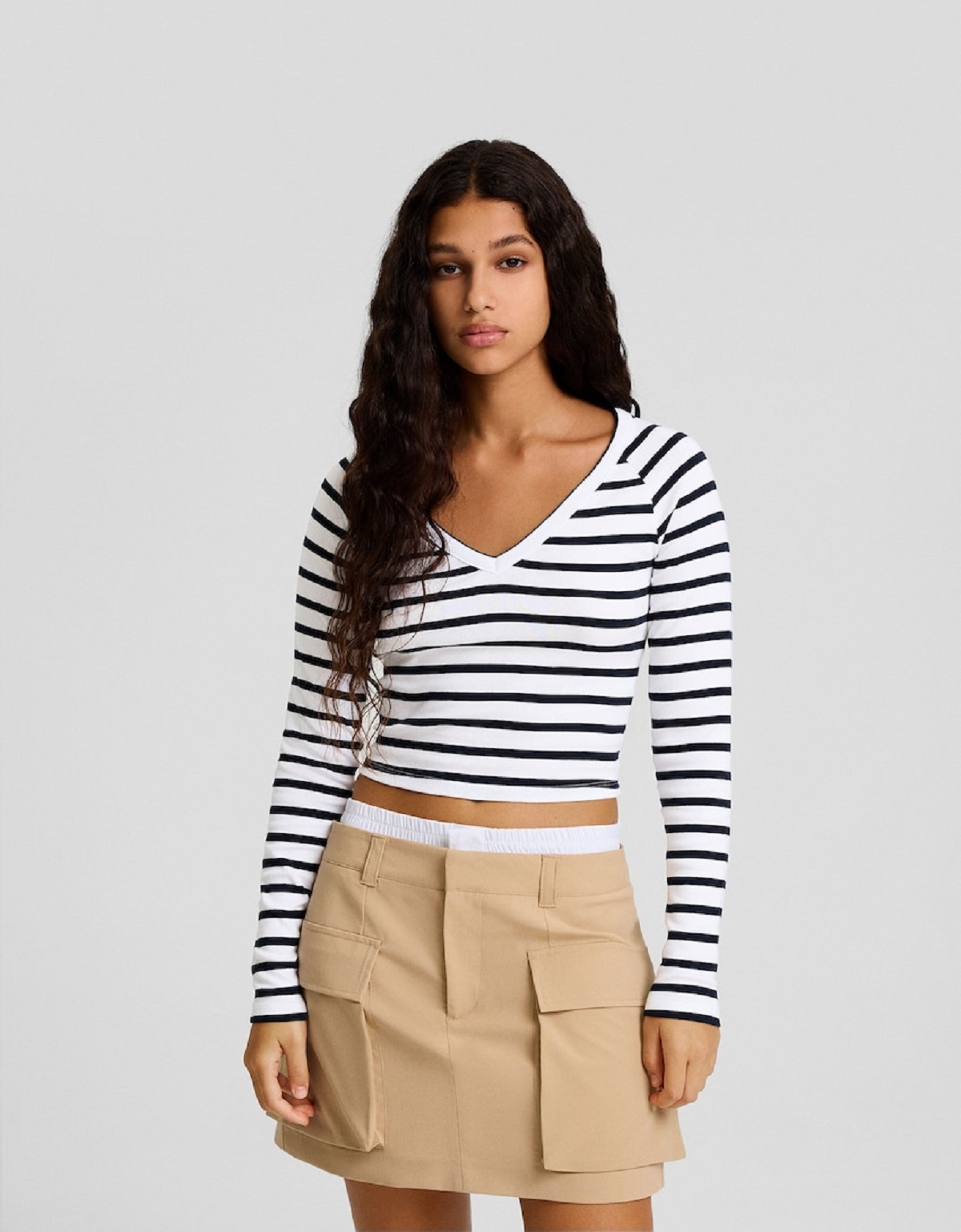 Con cuello en V, es una de las más buscadas en Bershka esta temporada. No podía faltar en esta selección. Es una maravilla tener una pieza como esta en nuestro fondo de armario. Permite aplicar un toque de elegancia a cualquier cosita que nos pongamos y es completamente atemporal. Esto quiere que, si bien está arrasando esta temporada, podrás seguir utilizándola el año que viene y el otro y el otro… ¡sin límite! Nunca quedará desactualizada y será el comodín perfecto ante situaciones inesperadas en las que quieres quedar bien sí o sí. Su precio es 9,99 euros.