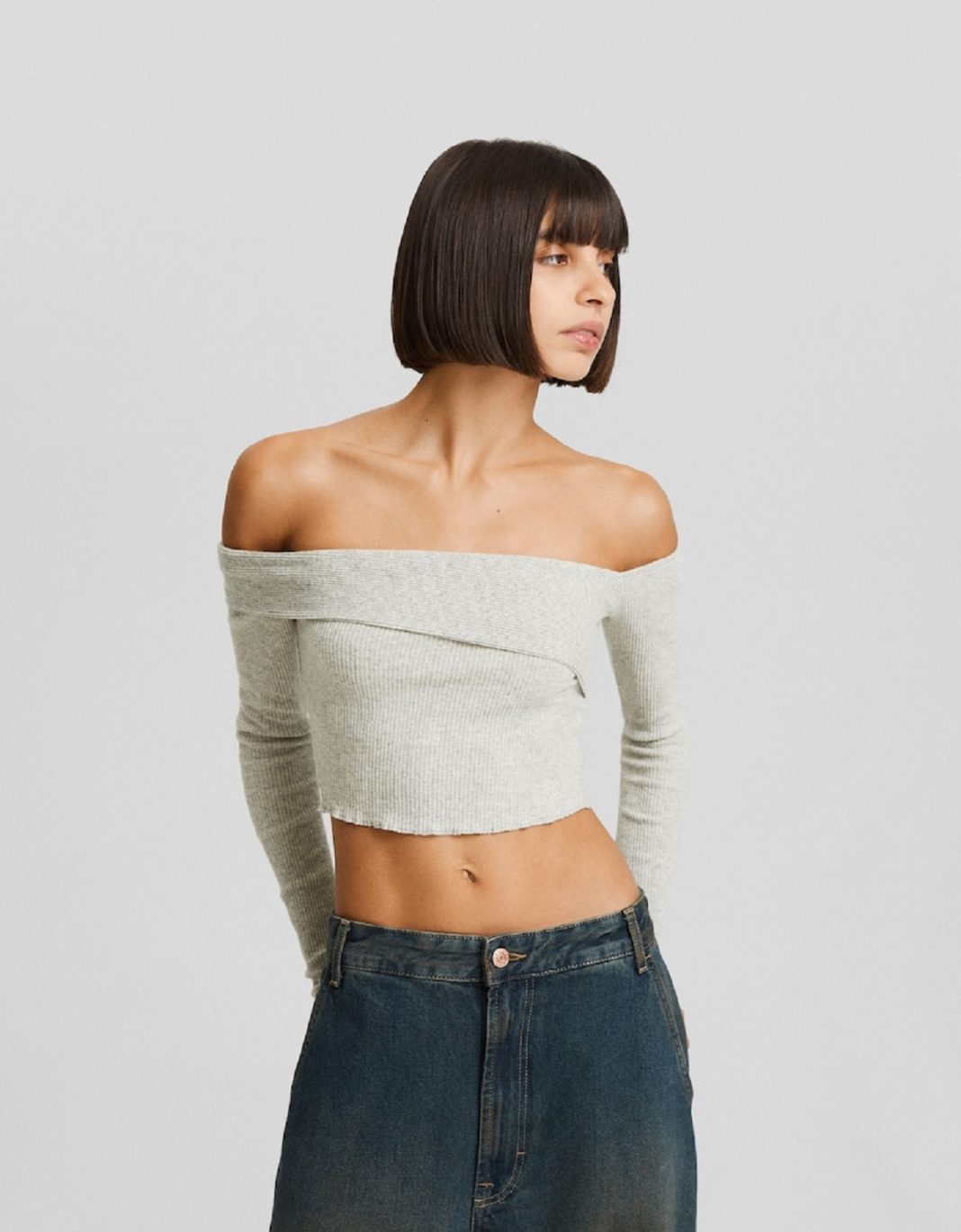 7Bershka: Camiseta manga larga punto asimétrica gris