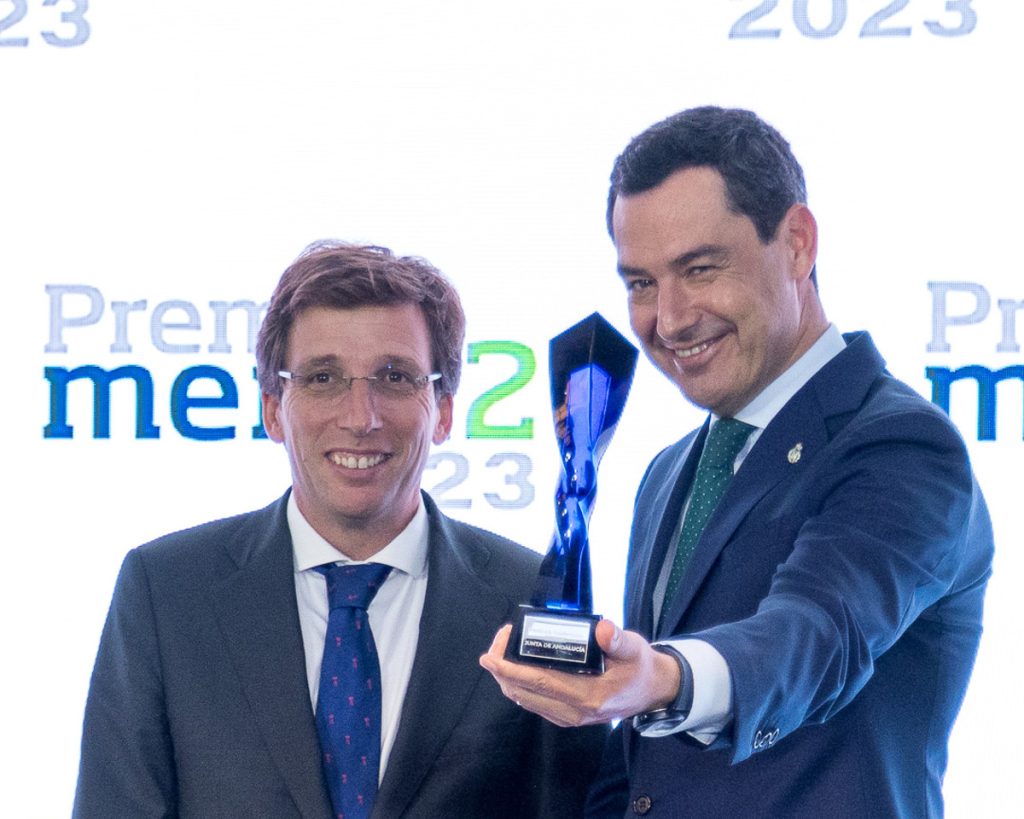 Juan Manuel Moreno Bonilla ha recibido de manos del alcalde Madrid, José Luis Martínez Almeida, y en nombre de la Comunidad de Andalucía, el premio MERCA2 de Transformación Económica.