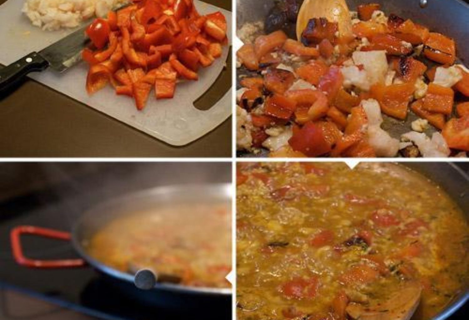 Mientras el caldo se prepara, corta el pimiento en trozos pequeños y sofríelo en la paellera junto con la ñora y los dientes de ajo laminados. Cuando el pimiento esté bien dorado, agrega el bacalao. Puedes desmenuzarlo mientras se dora o mantener los trozos enteros según tu preferencia.