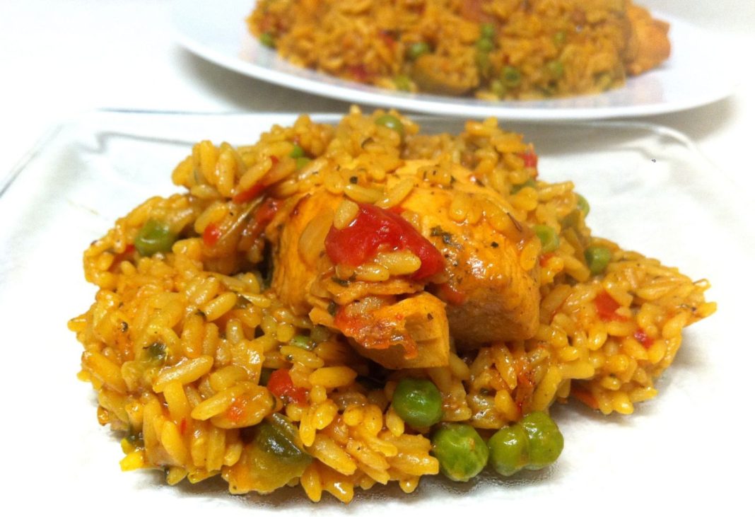 Sazona con sal y pimienta al gusto. Sirve el Arroz con Pollo caliente, decorado con rodajas de limón si lo deseas.