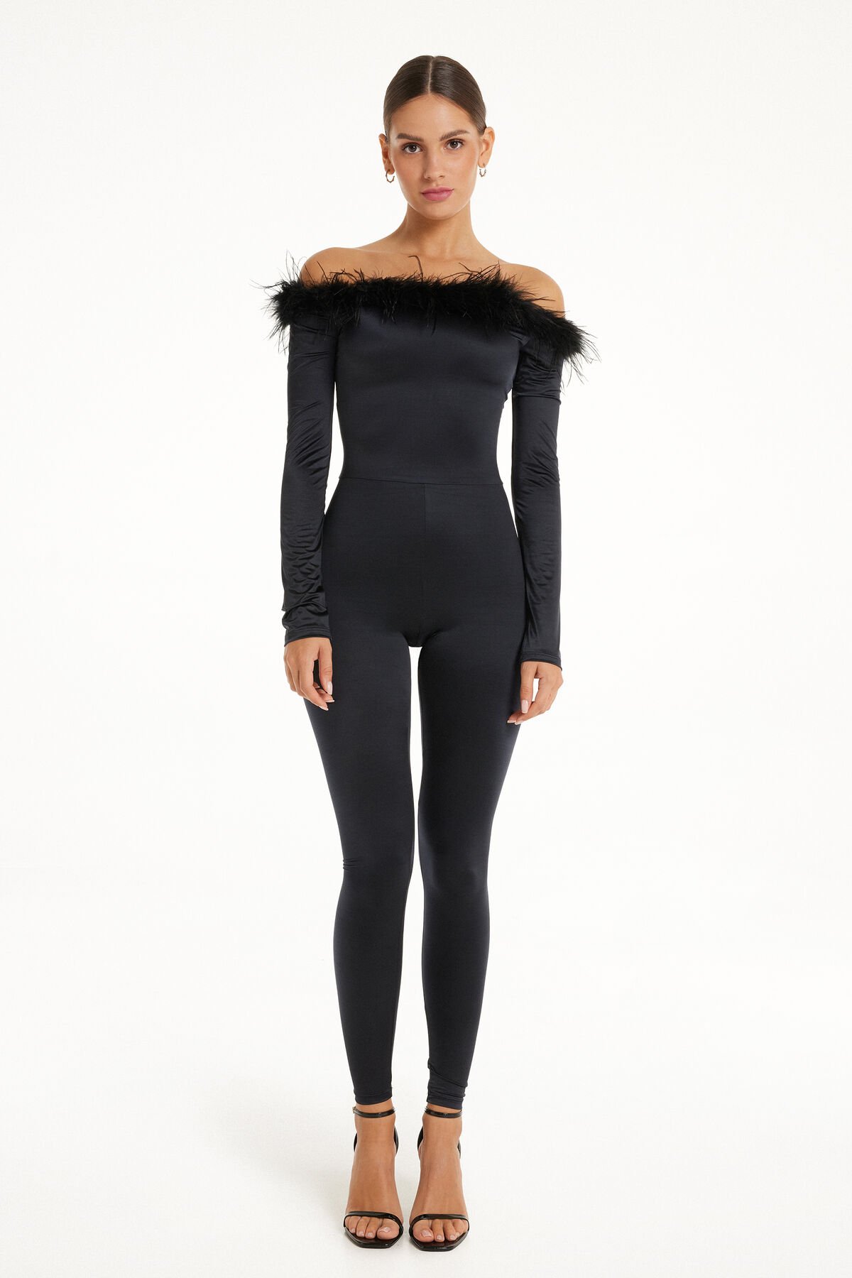 Son varios los monos que puedes encontrar dentro de la sección de novedades de Tezenis y todos ellos destacan por características que los hacen especiales. En este caso, uno de los que también llama la atención es este. Se trata de una opción de manga y pantalón largo, también muy ceñido al cuerpo, potenciando las curvas, gracias a su tejido de microfibra, con el que te sentirás más sexy que nunca. En esta prenda, el detalle que más destaca es el escote bargo rodeado de plumas en color negro, al igual que el resto del mono. Sofisticado, cómodo y elegante al mismo tiempo, además lo puedes conseguir por 49,99 euros. Es de Edición Limitada.
