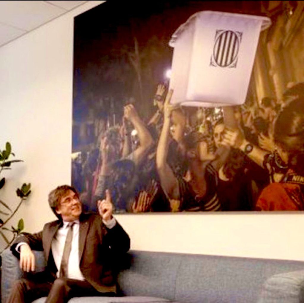 Ahora, en plena necesidad de apoyos para investir a Pedro Sánchez como presidente del Gobierno, el número 3 del PSOE, Santos Cerdán, complace de nuevo a Puigdemont en el mismísimo Parlamento Europeo, bajo un cuadro con una gran fotografía de un tumulto de independentistas portando una de las urnas del referéndum del 1-O. El PSOE se ha cuidado y mucho de mostrar la imagen que preside el despacho de Junts en la Institución de Bruselas, pero debido a su gran tamaño se muestran algunos detalles que la hacen inconfundible.