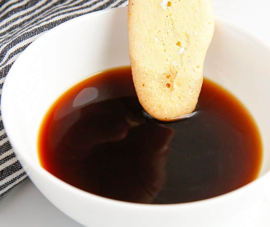 En un tazón, bate las yemas de huevo y el azúcar hasta obtener una mezcla cremosa. Incorpora el queso mascarpone y bate hasta que esté bien mezclado. Asegúrate de que la mezcla sea suave y sin grumos. En un plato hondo, vierte el café fuerte y sumerge brevemente cada galleta de soletilla. Ve colocando las galletas en el fondo del molde de la Air Fryer. Puedes romper las galletas si es necesario para que encajen mejor.