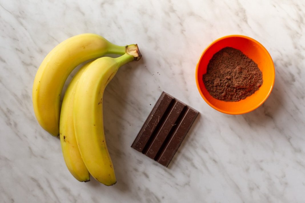 Coge unos plátanos maduros y trocéalos en rodajas. En una bandeja, coloca papel de horno y distribuye las rodajas de plátano en la bandeja. Coloca otro papel de horno sobre las rodajas de plátano y con la ayuda del culo de un vaso o una cuchara, machaca los trozos de plátano entre los dos papeles de horno hasta que obtengas una masa uniforme.