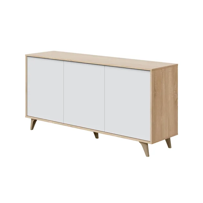 El complemento perfecto para tu salón comedor es este aparador de Leroy Merlin fabricado en melamina de alta resistencia acabado roble canadian y blanco artik. Este aparador combina con el resto de muebles de la misma Serie y está diseñado con tres módulos de almacenaje con puertas, lo que lo hace ideal para guardar platos, menaje, vasos o copas. Incluye 5 patas con base cuadrada en ABS acabado madera de gran resistencia que aportan estabilidad al mueble. Además, incluye las bisagras y los herrajes necesarios para su montaje y es fácil de montar y limpiar. El aparador cuenta con el sello FSC que garantiza que la madera utilizada proviene de bosques gestionados de una forma sostenible. Las medidas del aparador son 75 x 154 x 40 cm (alto x ancho x fondo) y su precio ha sido rebajado a 229,90 euros.