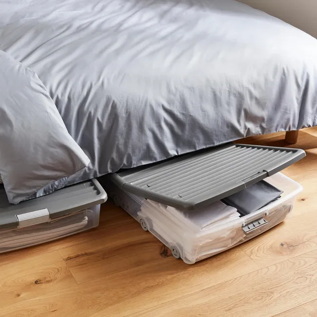 Haz el cambio de armario ayudándote con este bajocama de Leroy Merlin para un aprovechamiento óptimo del espacio. Este bajocama es perfecto para almacenar ropa y otros objetos sin ocupar espacios y tiene una capacidad de 55 litros. Las medidas del bajocama son 79 x 16,5 x 58 cm (ancho x alto x profundo) y dispone de ruedas para deslizarlo bajo la cama de manera sencilla. Además, cuenta con un alto nivel de transparencia para poder identificar su contenido sin necesidad de abrirla, una tapa abatible para poder acceder al interior solo por uno de los lados y un cierre con clip para garantizar la seguridad del cierre frente a polvo. El bajocama es apilable para aprovechar mejor el espacio sin necesidad de almacenar en una estantería. El precio de este producto ha sido rebajado en un 21% y ahora cuesta solo 15,99 euros.