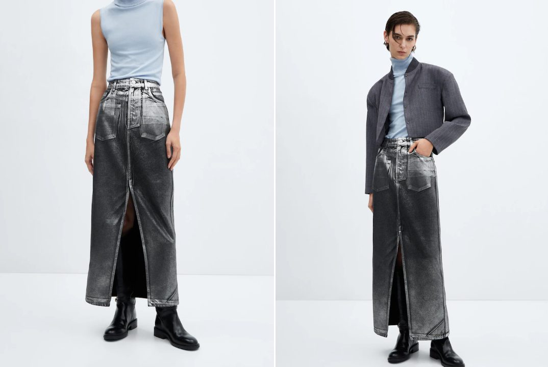 Otra de las opciones que más se están repitiendo este otoño, y que también seguirá siendo la favorita del invierno, es la falda larga de diseño vaquero. En este caso, desde Mango sorprenden con una propuesta diferente a través de esta falda vaqueta foil, que imita al típico jean, y que destaca gracias a su tono gris, perfecto para combinar con todo. Gracias a ella, podrás crear decenas de looks distintos y cargados de estilo. Larga hasta el tobillo, la puedes conseguir ya en la tienda por tan solo 39,99 euros. La querrás usar con todo.