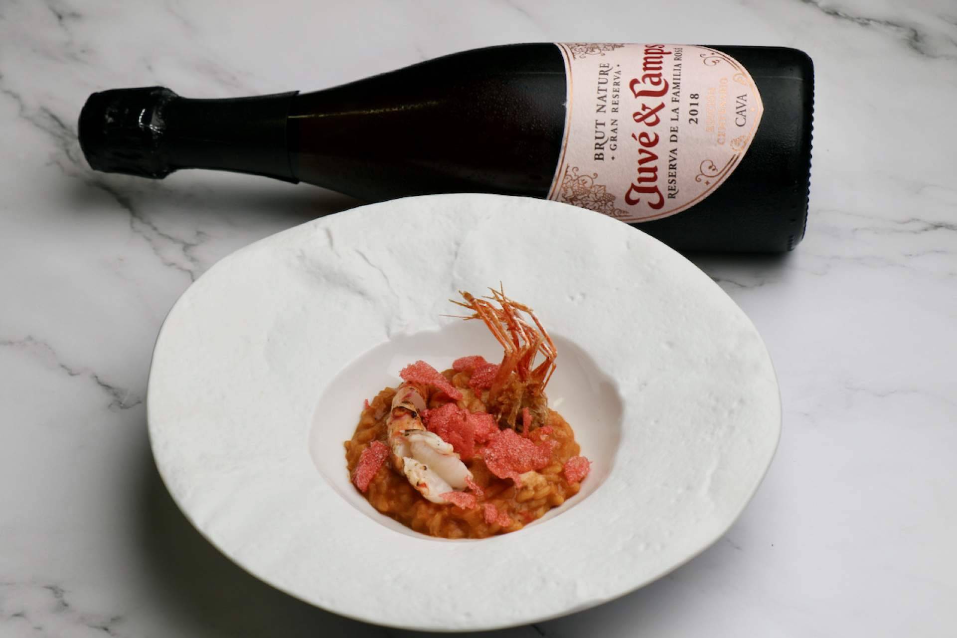 Cambio de tercio para entrar en el mundo de la carne, un meloso de vaca glaseado, praliné de bonito en semi-salazón, granada y altramuz sería la apuesta de José Antonio en su `Cuchara de vanguardia´. Y también de él, pero regresando de nuevo al mar, aparecía `La reina vestida de rojo´, un llamativo arroz, mantecado de gamba con ali-oli de coral y cristal de sus cabezas, a gala lleva el chef alicantino ser uno de los mejores chefs en la preparación de arroces. Tan diferentes platos tuvieron el mismo compañero de degustación, un Juvé & Camps Reserva de la Familia Rosé edición centenario 2018.