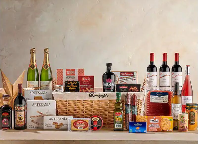 A la venta por 195 euros, es una cesta que incluye distintos dulces como turrón de Jijona, torta de turrón, figuritas de mazapán, bombones artesanía, trufas al cacao y neulas, entre otras. También incluye diferentes bebidas y conservas varias como bonito del Norte en aceite de oliva, mejillones al natural, aceitunas rellenas de anchoa y melocotón entero en almíbar.