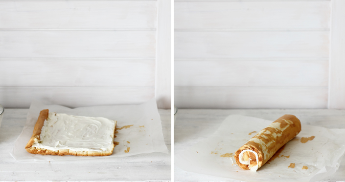 Luego, cubrimos el bizcocho con esta exquisita crema chantilly y procedemos a enrollarlo, para lo cual podemos ayudarnos con el papel vegetal. Una vez enrollado y bien cerrado, lo llevamos a la nevera para refrigerarlo durante aproximadamente una hora. Este tiempo en la nevera para que sea mucho más fácil cortar las porciones que se convertiran en nuestros queridos Phoskitos. Al sacarlos, se cortan en porciones de aproximadamente 1,5 cm.
