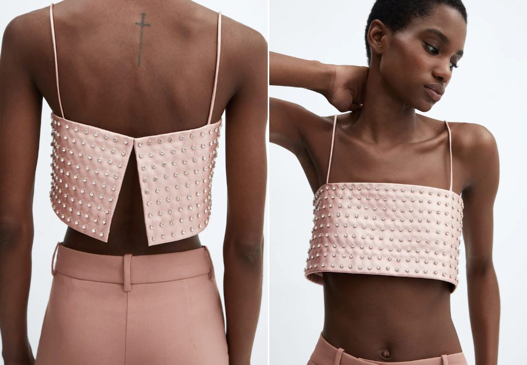 Los tops cortos no son solo para el verano y así lo demuestran dentro de la sección de novedades de Mango. Una de las prendas que te encantará, y que ya está disponible en la tienda de moda, es este crop top con tirantes y de color rosa palo, muy fácil de combinar. Llama la atención, entre otras cosas, graciasa a su acabado de efecto piel, que le da ese aire invernal, así como por sus detalles de cristales, perfectos para hacerte brillar allá donde vayas. Si hablamos de su precio, te puedes hacer con él por tan solo 49,99 euros. Lo necesitarás en tu armario.