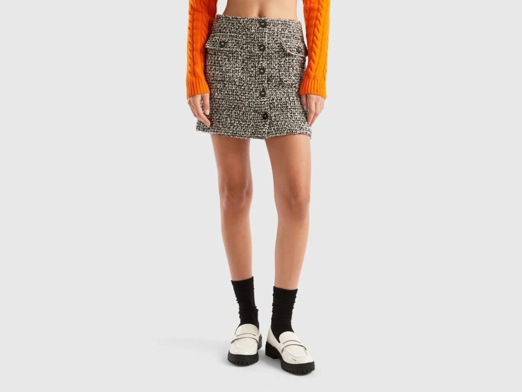 Si nos piden que hablemos de elegancia, a partir de ahora lo haremos con esta imagen. Esta minifalda es todo lo que está bien en términos de refinamiento. Una pieza cuidada al detalle y predispuesta para que la persona que la lleve puesta alcance el más alto de los éxitos. Hecha para triunfar y para sacar tu mejor versión. Un modelo suave confeccionado en mezcla de lana, forrada en viscosa mixta, cierre delantero de botones y bolsillos ribeteados con solapa y botón en la parte delantera. Perfecta para crear looks clásicos, refinados y femeninos. Su precio es 69,95 euros.