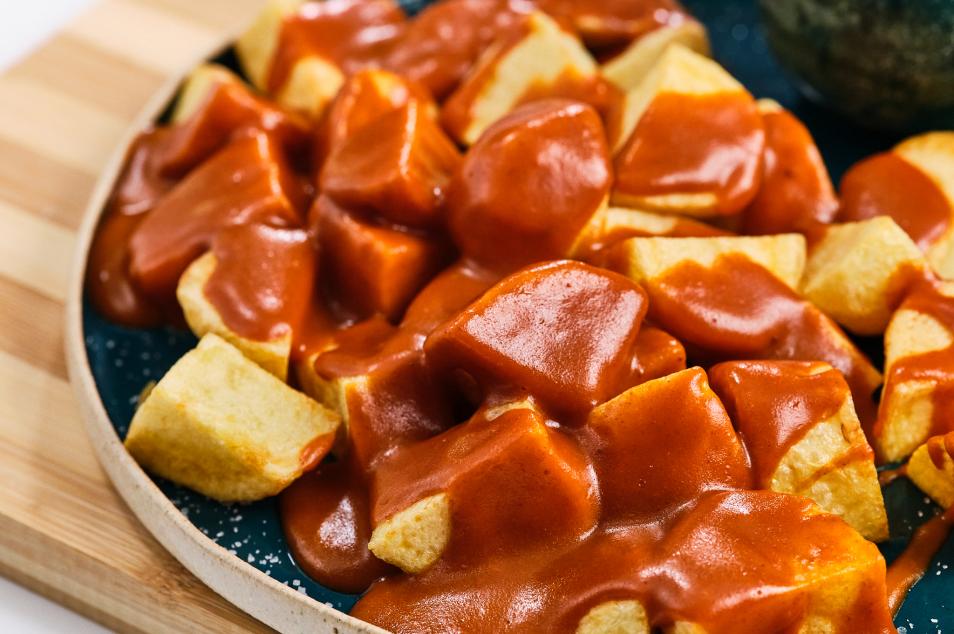 El montaje es una ceremonia en sí misma. Las patatas, recién salidas del horno, exhiben su tono dorado y su irresistible crujido. Estas cubiertas de salsa brava, generosamente vertida sobre ellas, adquieren un aspecto tentador. La salsa se mezcla con los cubos de patata, amalgamando sabores, texturas y temperaturas en un baile culinario que invita a los comensales a sumergirse en una explosión de sabores.