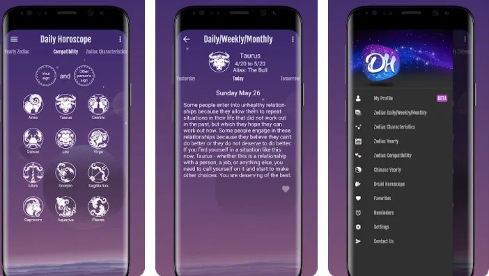 Daily Horoscope, con más de 10 millones de descargas en Android y una versión disponible para iPad, es una de las aplicaciones más completas en el ámbito de la astrología. Ofrece horóscopos diarios, semanales, mensuales y chinos, además de información sobre la compatibilidad zodiacal con otros signos. También proporciona predicciones basadas en el horóscopo druida y celta, relacionado con las fases lunares y los árboles del bosque, símbolos de vida y protección para los celtas.