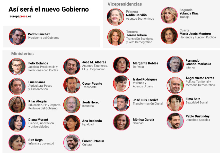 Pedro Sánchez no realiza ningún recorte en el nuevo Gobierno. Mantiene así los 22 Ministerios de la anterior legislatura, pero con cambios de calado. Ángel Víctor Torres, expresidente de Canarias, y Jordi Hereu, ex alcalde de Barcelona, serán los nuevos grandes nombres en un Ejecutivo que casi repite en su totalidad.