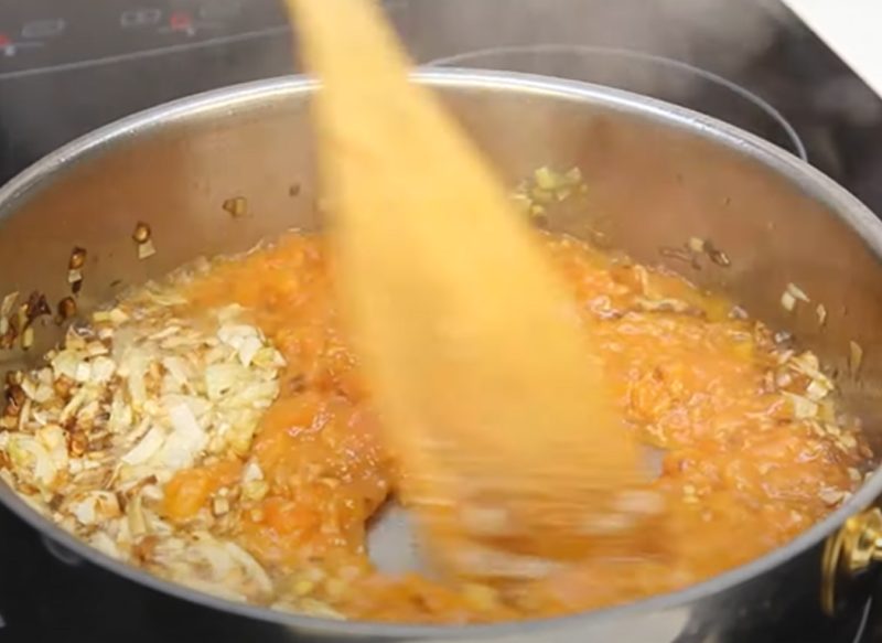 Salpimentar y sofreír hasta que la cebolla comience a estar dorada. En ese momento habrá que agregar la salsa de tomate casera y remover, para luego añadir una cucharadita de pasta ñora y el vino blanco, y subir el fuego a una temperatura alta para así conseguir que se evapore el alcohol.