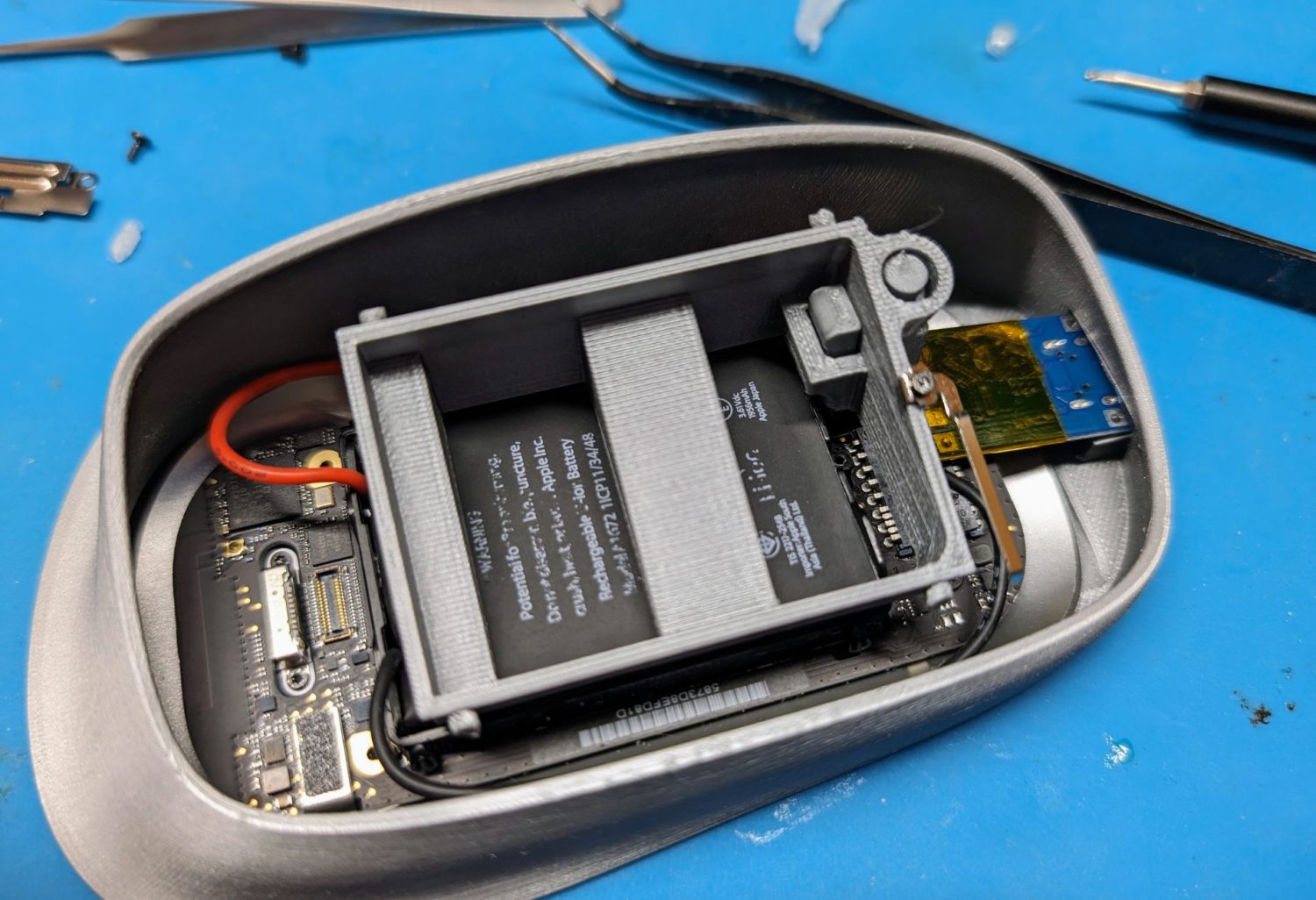 Aunque Apple impone limitaciones al uso del ratón mientras se carga, Ivan Kuleshov ha logrado sortear estas restricciones mediante un ingenioso «hack». En primer lugar, diseñó y fabricó una carcasa externa con una impresora 3D. Luego, llevó a cabo la soldadura de un módulo de carga TP4056 con conector USB-C, burlando así los protocolos de Apple y permitiendo el uso continuo del dispositivo durante el proceso de carga.