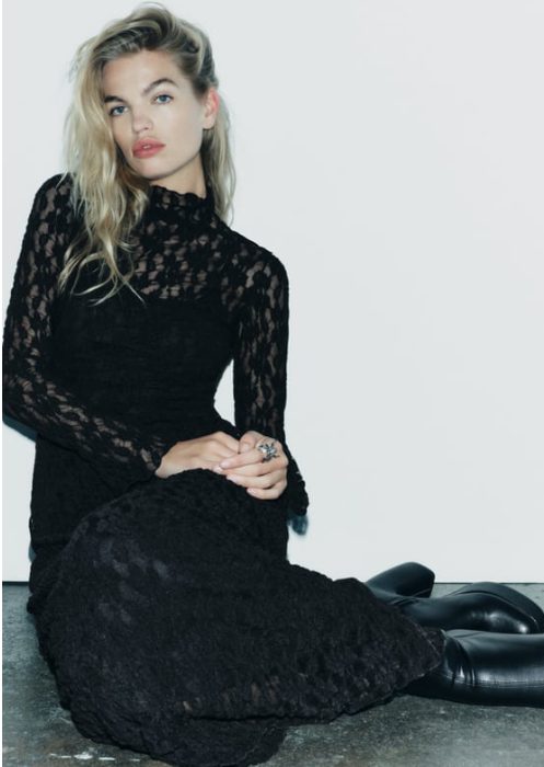 Siguiendo con la estela del diseño del impresionante vestido de Rosalía, dentro de las novedades de Zara también podrás elegir opciones muy similares al de la cantante. Un buen ejemplo lo tienes en este vestido de corte midi firmado por el gigante de Inditex. También de color negro, destaca por estar creado por encaje al completo y por sus transparencias. Con cuello subido y manga larga, este sí cuenta con un forro interior al tono para que no tengas que preocuparte de cómo combinarlo. En este caso, su precio se sitúa en tan solo 35,95 euros. De nuevo, una alternativa que no querrás dejar escapar.