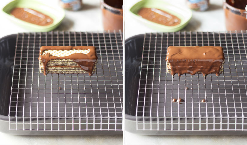 Picamos el chocolate y lo combinamos con el aceite en un cuenco. Fundimos la mezcla en el microondas en intervalos cortos de 30 segundos para evitar quemaduras. Una vez listo, sumergimos cada barrita en el chocolate derretido hasta la mitad. Escurrimos el exceso de chocolate y colocamos las barritas sobre una superficie plana con el baño en la parte superior. Este paso asegura una cobertura uniforme y una presentación de las barritas muy parecida a la de los famosos Huesitos industriales.